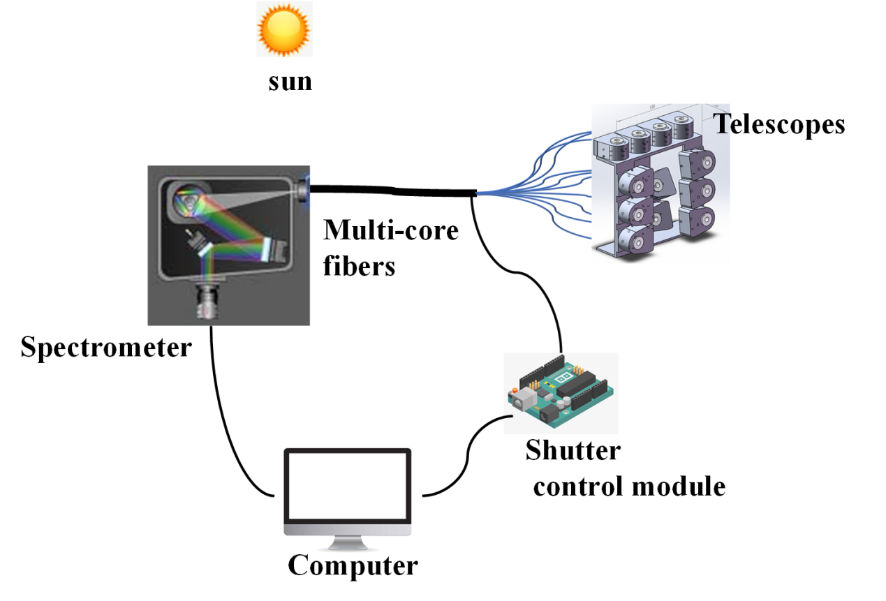 團隊基于離軸多路光譜遙測的思想,采用科研級CCD成像光譜儀,自主設計的小視場角望遠鏡、Y型同軸分束光纖、多路機械快門控制模塊實現了分鐘級同步多軸的光譜采集,突破了以往多軸差分吸收光譜(MAX-DOAS)系統的采集時間分辨率限制。研究成果有望成為車載移動平臺大氣監測的核心設備,為大氣污染監測和污染源溯源研究提供有力支持。