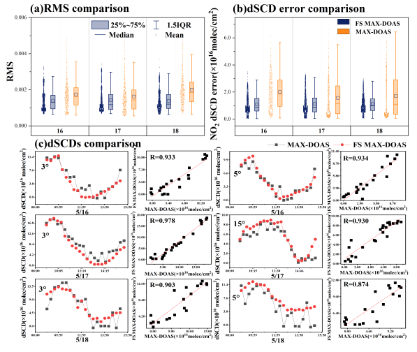 研究團隊采用多仰角同步采集的方式取代了單鏡頭順序采集,構建了一套地基、車載均適用的同步多軸遙測系統,實現了一個循環仰角光譜的分鐘級探測,如圖2所示,傳統MAX-DOAS的系統分辨率一般為七分鐘,新系統極大提升了采集時間分辨率。在外場試驗中,同步多軸系統與MAX-DOAS、LP-DOAS系統同期觀測的結果如下:在DOAS方法反演痕量氣體斜柱濃度中,RMS、dSCD誤差是衡量濃度準確性的重要指標,同步多軸系統反演NO2、HCHO的RMS、dSCD誤差均低于MAX-DOAS,兩系統反演NO2、HCHO濃度的相關性分別為0.978和0.850,由于提高了時間分辨率,同步多軸系統反演的氣體廓線結果比MAX-DOAS的更細致;NO2近地面濃度對比實驗中,同步多軸系統與LP-DOAS系統測得的數據相關性高達0.901。后續同步多軸系統將繼續拓寬其在高時間分辨污染氣體立體分布遙感領域的應用,發揮其多仰角多組分同步監測的優勢。