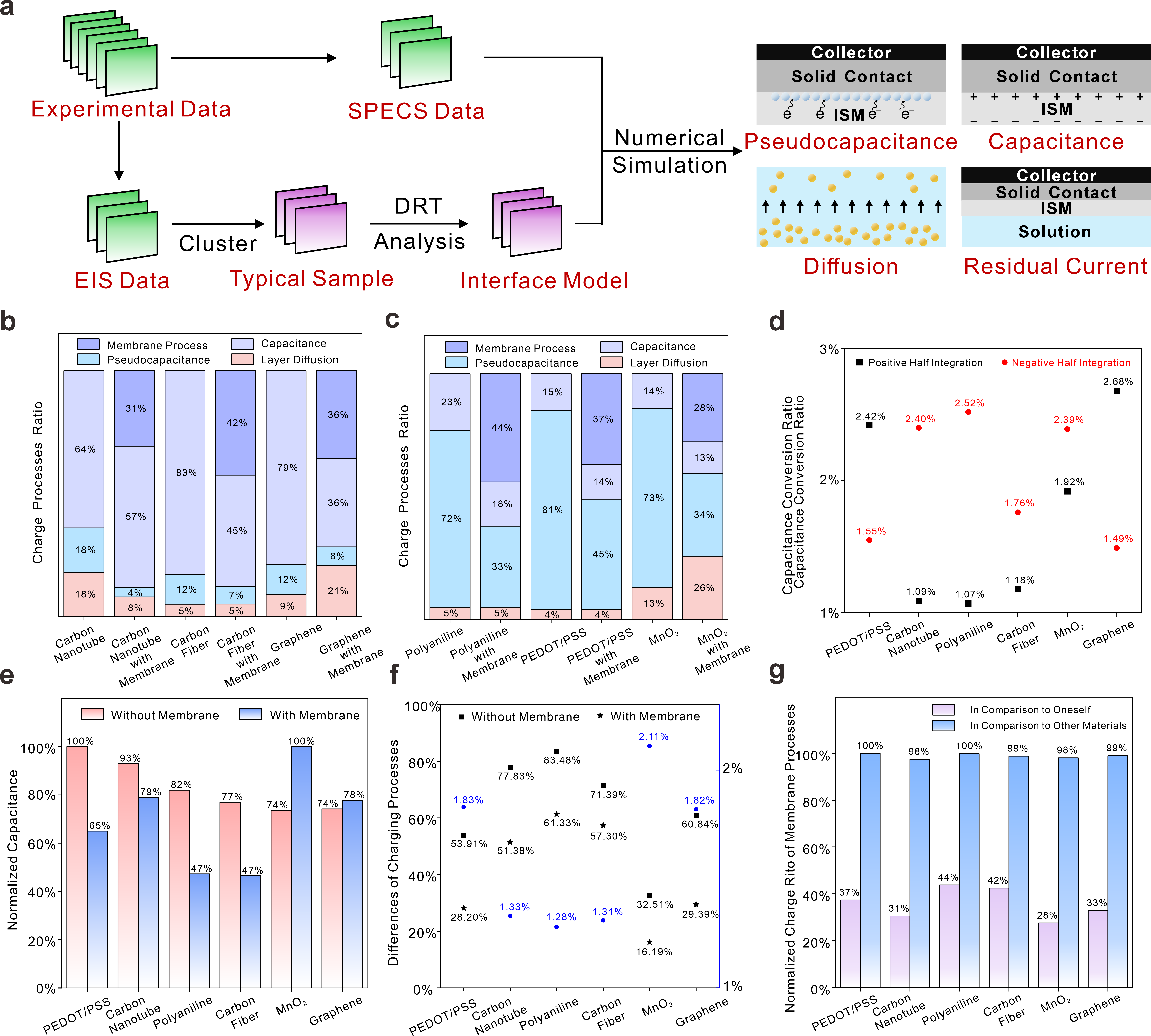 團隊進(jìn)一步研究發(fā)現(xiàn),在不同過電位條件下,電荷存儲過程中的對稱性與電容轉(zhuǎn)化率存在關(guān)聯(lián);離子選擇性膜的存在會限制不同材料的電容性能,導(dǎo)致工作狀態(tài)下轉(zhuǎn)導(dǎo)層界面電容與無膜修飾電極電容存在顯著差異。該研究表明在固體轉(zhuǎn)導(dǎo)層材料開發(fā)中,不僅需要關(guān)注高疏水與大電容特性,也要重視材料與離子選擇性膜之間的相互作用,應(yīng)使電荷存儲過程在不同極性過電位下保持相對均衡,同時需考慮離子選擇性膜對轉(zhuǎn)導(dǎo)層材料充放電過程的制約程度。