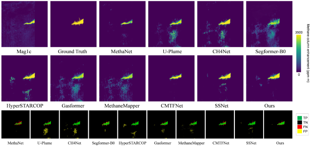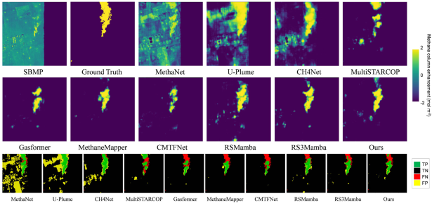 點源煙羽精確分割是排放量估算的核心環節。針對點源排放羽流遙感分割中存在的全局上下文建模不足、頻譜相似干擾物導致誤檢率高等問題,研究團隊分別提出了兩種創新性的解決方案:聚焦于全局特征感知,基于FSDINet融合頻域與空間域的甲烷羽流分割網絡方法將多尺度光譜特征注入頻率域與空間域,實現了全局信息捕捉與局部細節重建的協同建模;側重誤差控制與小目標聚類,使用kMetha-Mamba K均值曼巴甲烷分割模型方法引入基于譜導數特征的改進型k-means聚類機制,結合Mamba狀態空間模型提升弱信號的識別精度與抗干擾能力。
