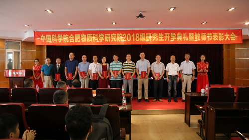 吳四發副院長宣讀了《關于表彰2018年度合肥物質科學研究院優秀研究生導師的決定》。王英儉書記為獲得表彰的部分導師代表頒獎并合影留念。隨后,優秀導師代表、固體物理研究所張海民研究員代表受表彰的優秀導師發言,張海民研究員首先祝福各位老師節日快樂,歡迎各位新同學的到來。張海民研究員指出導師和學生之間是相互信任,相互學習,相互進步,相互提高的一種關系。老師和學生通過科研工作為紐帶建立師生關系,老師更希望與同學建立更深厚的朋友關系。