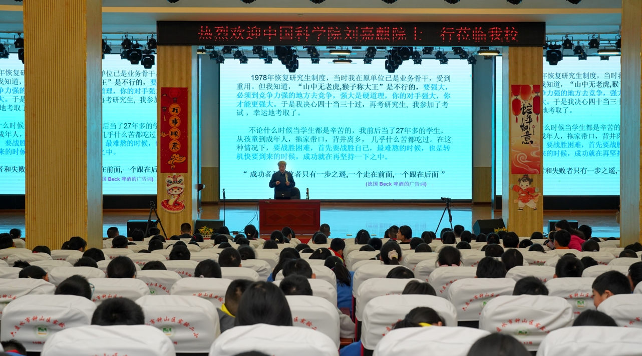 中國科學院院士、地質學家劉嘉麒帶來《艱苦奮斗 精忠報國——人生當自強》科學家精神科普報告。劉院士結合自身的學習和科研經歷,指出做人要立志,立志先做人,強調受教育是成人的根本途徑,培養人才要從娃娃抓起,在玩中學,學中玩,興趣是聰明的催化劑,要求學生培養一流品格,崇尚科學,踐行科學,發揚科學家精神,鼓勵青年學生樹立遠大志向,勇于創新,善于思考,為實現中國夢貢獻力量。